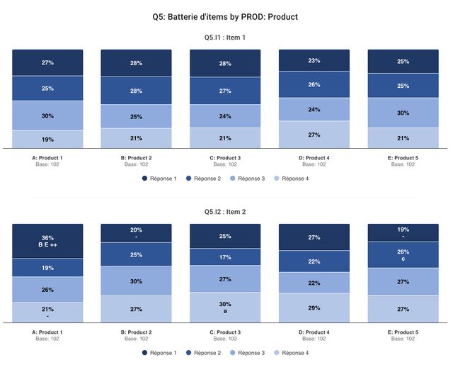 Example scenario: You select "Product" as the crossover variable. Your dashboard contains satisfaction questions, NPS, and demographic data. Each question now displays: