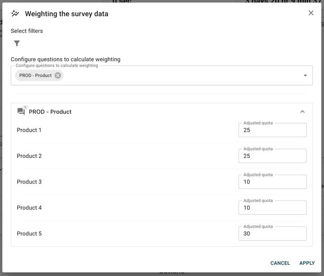 Scenario: Your survey has 1,000 responses, but Product 5 represents only 15% of responses while it accounts for 30% of your actual customer base. By raking to 30%, responses from Product 5 users receive higher weight, and responses from over-represented products receive lower weight. This produces statistics that better reflect your true customer population.