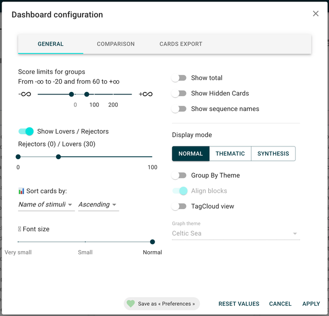 La plateforme R3M offre une variété de paramètres pour personnaliser l'affichage des cartes sur votre tableau de bord. Ces paramètres vous permettent d'adapter la visualisation des résultats d'activation émotionnelle à vos besoins d'analyse et préférences de présentation.