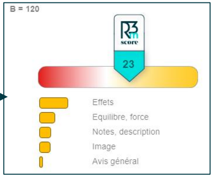 - Le mode synthèse fournit une vue résumée des scores R3M et des indicateurs clés (comme % amoureux et % détracteurs) pour chaque stimulus.
