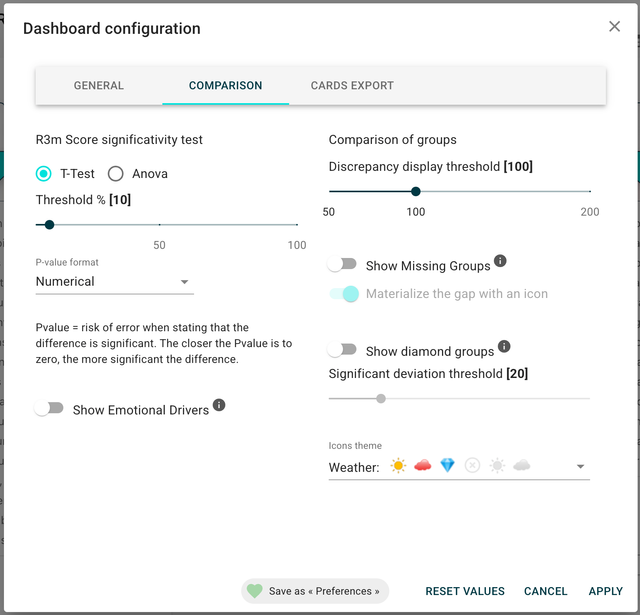 - Paramètres de comparaison : Personnalisez les icônes, affichez les mots manquants ou "diamants", et ajustez les seuils de significativité.