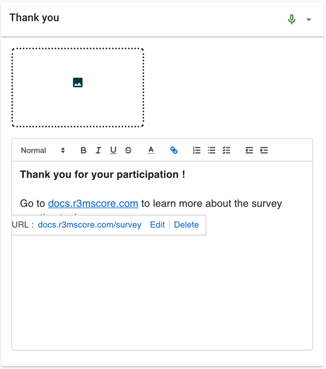 Ce bloc est automatiquement placé à la fin du formulaire, garantissant que tous les questionnaires complétés se terminent par votre message de fin désigné.