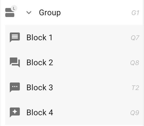 Les blocs de groupe sont des conteneurs organisationnels qui vous permettent de structurer le contenu de votre questionnaire et de contrôler comment les blocs sont présentés aux répondants. C'est un bloc dans lequel d'autres blocs (questions, transitions, etc.) peuvent être imbriqués. Les groupes fournissent des fonctionnalités puissantes pour la randomisation, l'itération et la conception expérimentale, les rendant essentiels pour les structures de questionnaire complexes.
