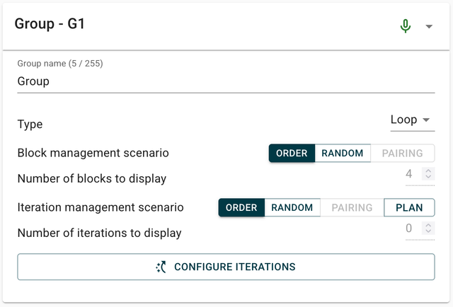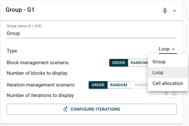 La boucle permet de répéter les blocs imbriqués à l'intérieur un nombre de fois égal au nombre d'itérations définies. Les groupes de boucle permettent une présentation itérative du contenu, parfaite pour les mesures répétées ou les évaluations multi-stimuli.