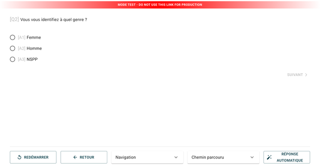 Le mode Testeur est un environnement de test spécialisé conçu spécifiquement pour la validation des questionnaires et l'assurance qualité. Ce mode vous permet de tester minutieusement votre questionnaire sans affecter les données de production.