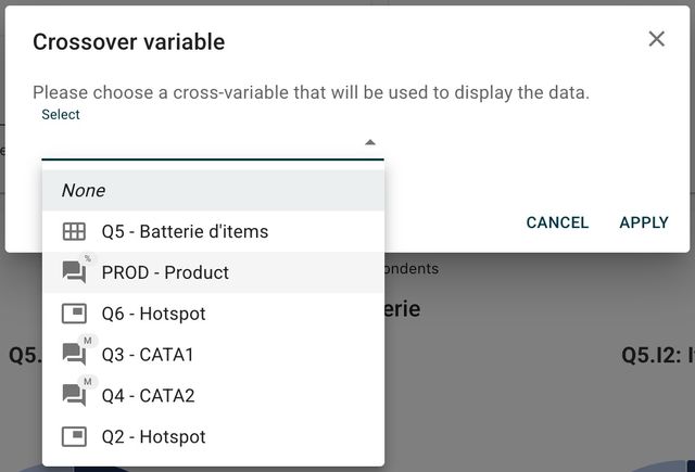 - Dans la boîte de dialogue, sélectionnez la question que vous souhaitez utiliser comme variable de croisement (ex. « Produit »).