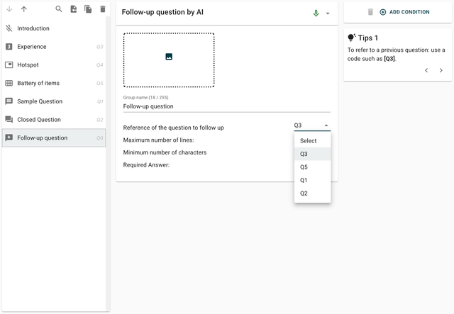 Pour créer une question adaptative, vous devez établir une référence à une question existante dans votre questionnaire qui servira de base pour le suivi.