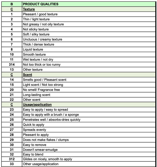 - Si vous devez regrouper des thèmes (ex. : "usage" combinant texture + odeur + utilisation/application), faites-le dans votre analyse, pas dans le fichier de cadre de codification.